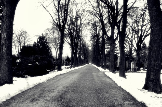 Einer der vielen Alleen des Zentralfriedhofs. Grau und kahl führen die asphaltierten Pfade in ganz unterschiedliche Welten.