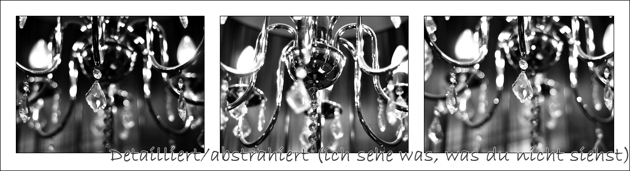 Hmmm…jetzt habe ich mir ziemlich lange beide Serien angeschaut und stimme letztendlich für die 2. Reihe. Und zwar aus dem Grund, weil in drei Bildern die drei „Tasten“ abgebildet sind. Eine vollendete Reihe also. Bei dem Kronleuchter ist die Reihe nicht so vollendet. Man geht zwar immer näher heran, es ist aber nicht so eine in sich geschlossene Serie wie bei der unteren Reihe, weil man theoretisch ja noch näher herangehen könnte.