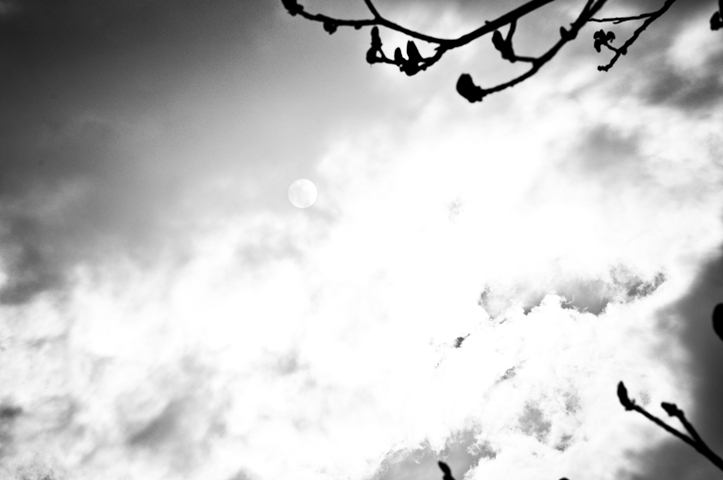 1. Ok, das ist aber so gar nicht mein Fall. Ausgebrannte Wolken wechseln sich mit dunklen Schatten ab – ein zu kontrastreicher Himmel, noch dazu die (noch mehr Kontrast bringenden) Äste, die wie sie wollen ins Bild ragen – unscharf, nur als Zipfel zu erkennen, ungünstig angeschnitten – und das dann auch nur rechts, was dem Bild einen seltsamen Schwerpunkt gibt. Ist der weiße Kreis der Mond? Man erkennt ihn nicht wirklich, auf mich wirkt er folglich irgendwie irritierend.
