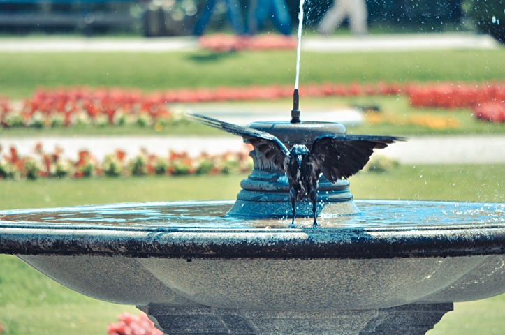 Ich finde, leider wird dem Vogel durch die Brunnenmitte ziemlich die Show gestohlen – vielleicht etwas mehr von der Seite (mit Blumen im Hintergrund) oder allgemein freigestellter (z.B. näher dran, weiter geöffnete Blende) hätten schon den Trick getan. Dann wären die schönen Wassertropfen besser rausgekommen – und das Blumenboket wäre eventuell noch schöner gewesen.