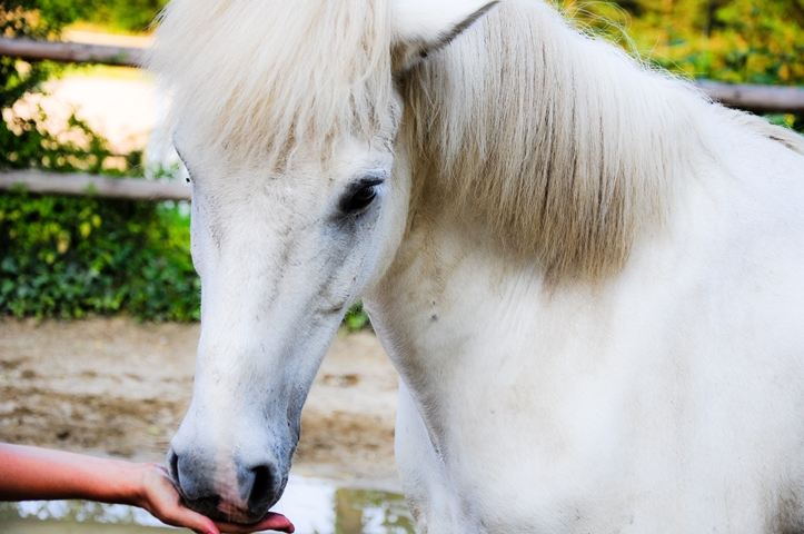 Der weiße Wallach heißt ‚Klaki‘, was auf isländisch soviel wie ‚Schnee‘ bedeutet. Auf dem ersten der beiden Fotos fehlt ihm nur das Horn auf der Stirn um glaubhaft als Fabelwesen durchgehen zu können. (Der Schein trügt übrigens, er ist ein ganz schön Frecher!)
