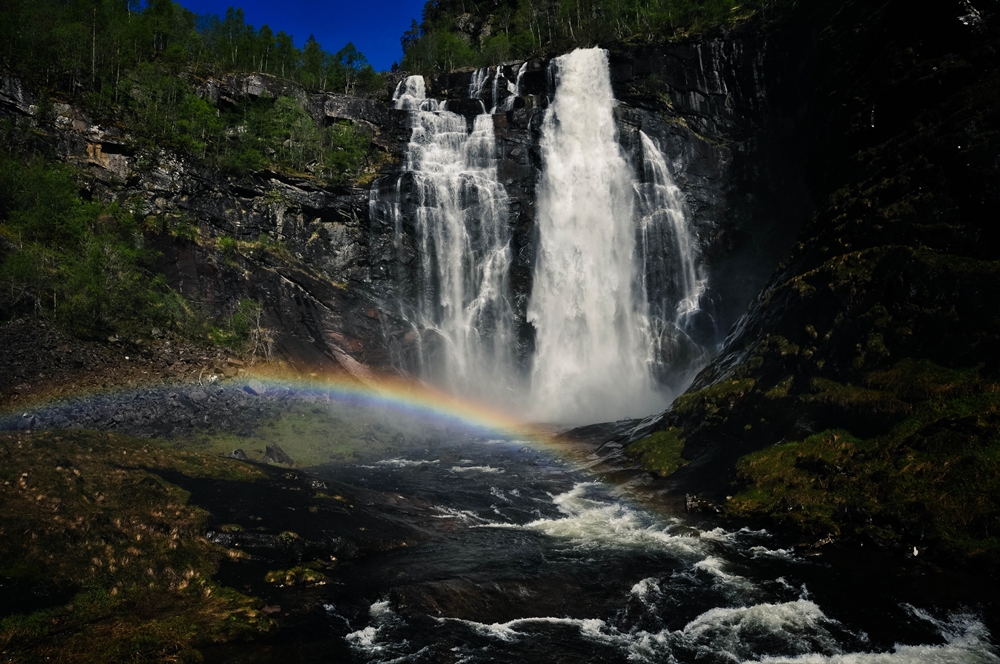 Das vierte Foto zeigt den Tvindevossen, oder? Wahrscheinlich seid Ihr auf dem Weg von Voss zur Stalheimskleiva und zum Nærøyfjord dort vorbei gefahren. Das Regenbogenfoto gefällt mir gut, so schön strahlend von den Farben bekommt man die meistens nicht ins Bild.