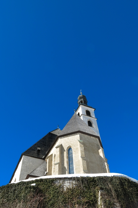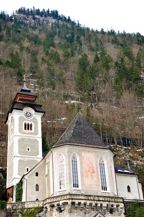 Die Kirche in Hallstatt, „oben“ am Berg.