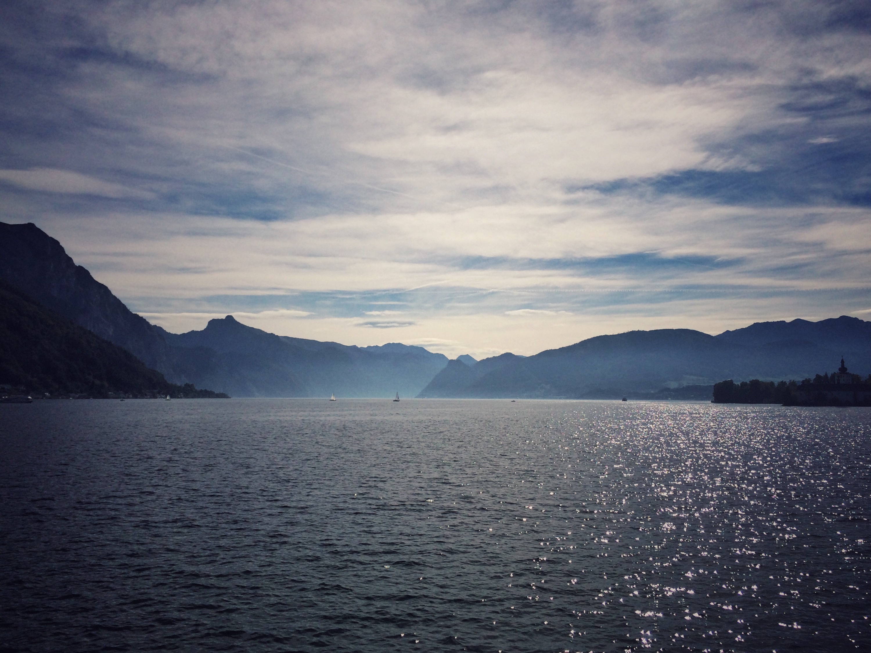 Etwas passt zusammen. Es stimmt, es ist richtig. Und in Gmunden am Traunsee, da kann man bei Sonnenschein auf der Seeterrasse der Konditorei Baumgartner mit Schokomandelschnitte und Früchtetee auf die Pausetaste drücken. Wenn man den Blick über den See schweifen lässt und das Glitzern der Sonne beobachtet, wie sich die Berge im dunstigen Gegenlicht verlieren, dann ist für einen Moment die Welt wieder im Gleichgewicht. Hier ist alles stimmig. Das Wetter, die Menschen, die Mehlspeisen und das Wasser. Hier steht die Zeit ein wenig still, man weiß nicht genau – haben wir schon 2015? 1995? Oder doch 1975? Vielleicht ist es auch schon 2035. Der Traunsee glitzert in der Sonne und die Schokomandelschnitte schmeckt ein bisschen nach dem kleinen Glück.