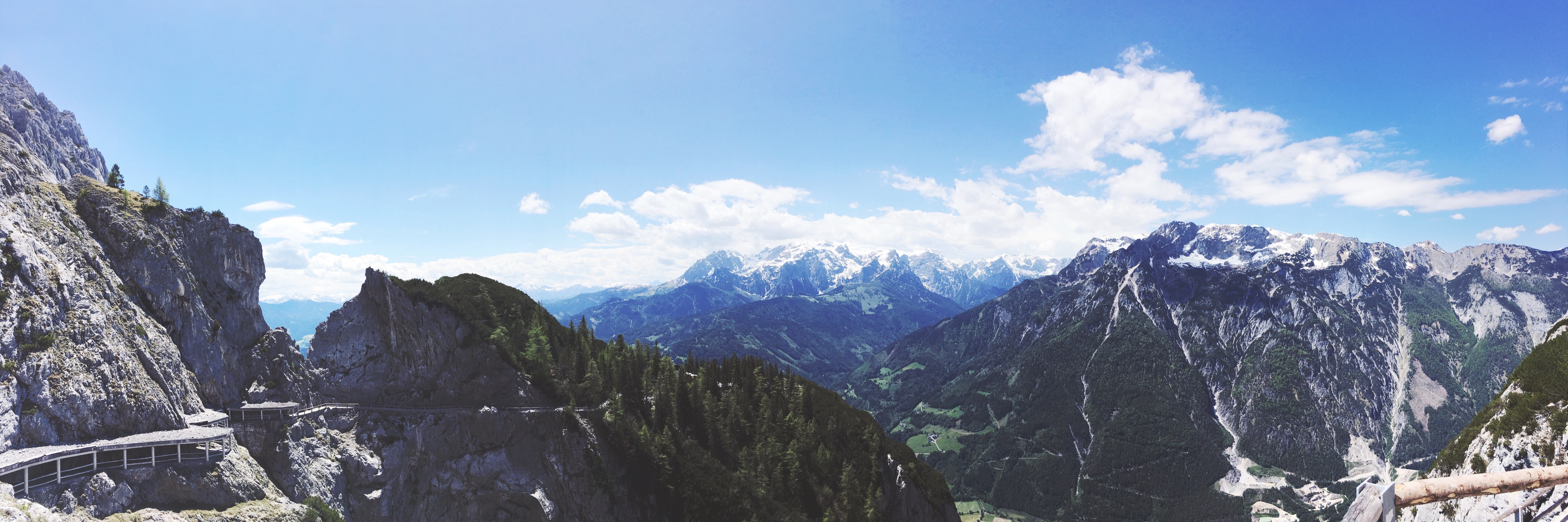 …die etwas abgelegen im Tennengebirge liegt. Leider gibt es von der Höhle selbst keine Fotos, es herrscht strenges Fotografierverbot, da das Blitzen dem Eis schadet und Fotos die ganze Gruppe aufhalten. Der Blick vom Höhleneingang ist allerdings ebenfalls umwerfend und bombastisch und allein dafür lohnt sich der 40minütige Aufstieg (MIT Seilbahn, wohlgemerkt!) auf jeden Fall. Die Höhle ist jedenfalls nichts für gänzlich Unsportliche, der Eingang ist nur mit oben genanntem Fußmarsch zu erreichen und innerhalb der Höhle werden 1.400 Stufen in 143 Höhenmetern zurückgelegt.
