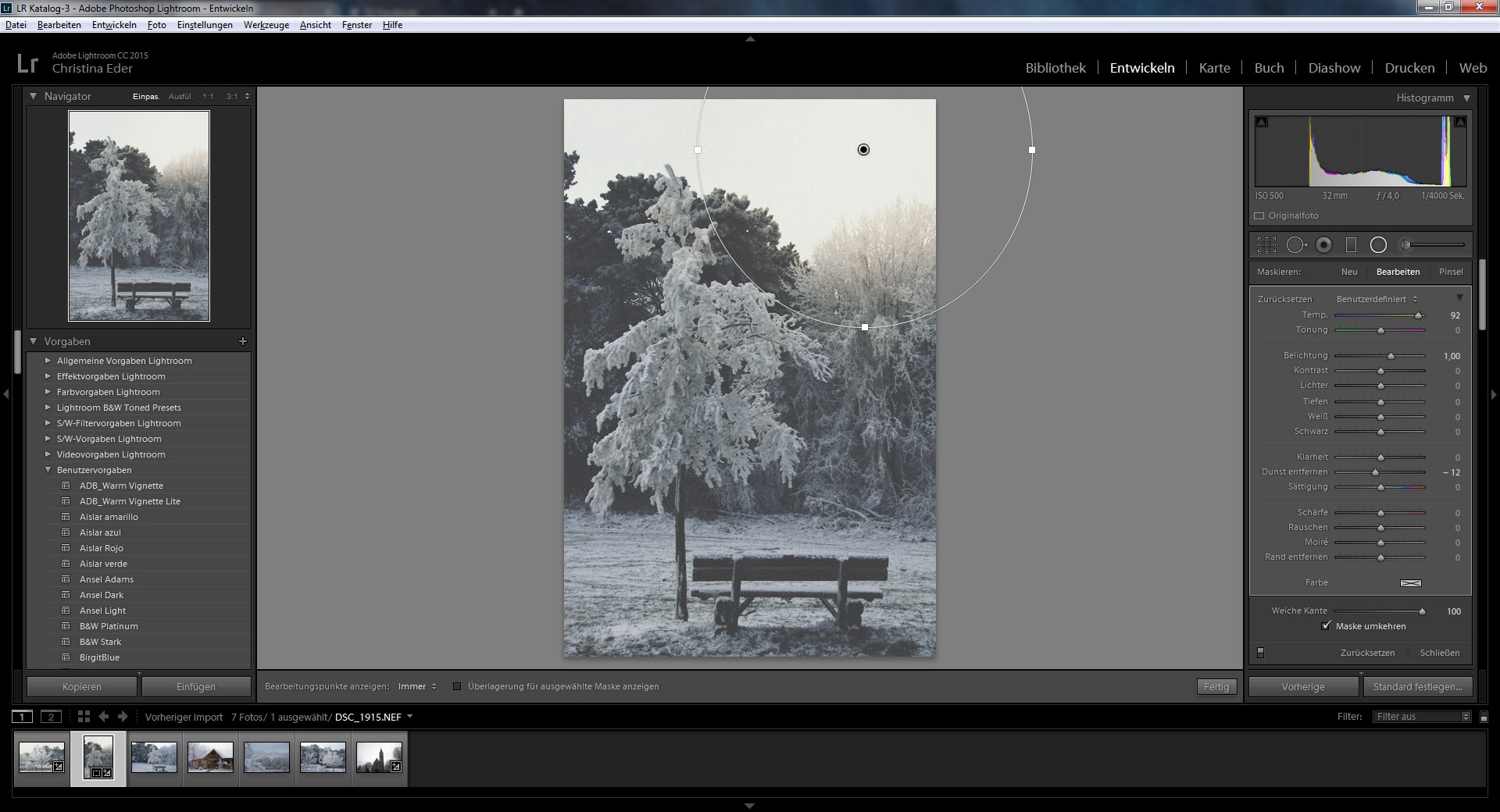So und nun fragt ihr euch wahrscheinlich, ob ich eventuell beizeiten dran denke, euch zu verraten, wie ich das denn gemacht habe. Das ist im Grunde wirklich erstaunlich einfach. Ihr braucht dazu nur Lightroom zu öffnen (ich habe hier die Verson CC, keine Gewähr, dass es bei anderen Versionen nicht etwas anders aussieht) und ein ausgewähltes Foto reinzuladen. Dann klickt ihr bei Entwickeln auf den Radial Filter. Mit dem zieht ihr eine Form, wo der Lichtfleck erscheinen soll. Wichtig sind folgende Einstellungen: weiche Kante auf 100% und dann „Maske umkehren“. Danach zieht ihr den Temperatur-Regler des Radialfilters ins warme und schraubt die Belichtung noch etwas rauf. Um den Effekt bei einigen Bildern noch zu verbessern, habe ich den Regler „Dunst entfernen“ nach links gezogen. Voilà, das wars!