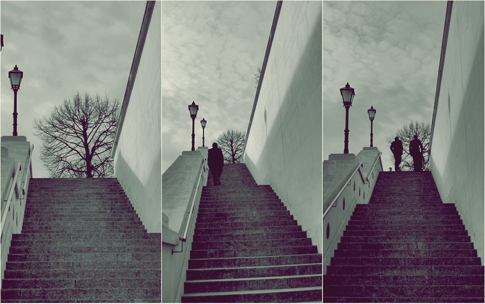 Ihr seht hier ein Bild, das nicht nur in die Serie ‚Sinfonie der Großstadt‘, sondern auch zu Gesetz der Serie passt ^.^ Es ist ein Bild der Stiege hinter der Albertina beim Burggarten. Ich mag die Aneinanderreihung der Fotos, auch wenn die Perspektive nicht genau dieselbe ist und es möglicherweise besser wirken würde wenn der Ausschnitt nicht anders wäre. Trotzdem. Stellt euch vor, ihr seht das, was drei Leute, die nebeneinander stehen, sehen…